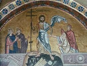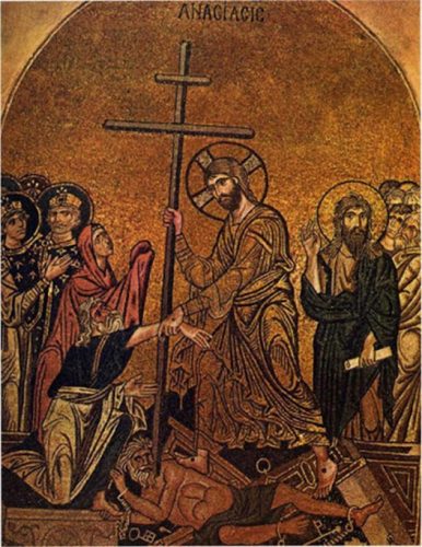 Nel mondo bizantino, invece, la Resurrezione (ανάστασις/Anástasis) non viene mai rappresentata come un fatto “storico” visibile, poiché nessuno ne fu testimone. Per questo l’arte orientale sceglie di raffigurare ciò che la Resurrezione produce: la liberazione dell’umanità dalla morte. Nasce così l’iconografia della Discesa agli Inferi, in cui Cristo irrompe nell’Ade, infrange le porte dell’Inferno e libera i giusti trattenuti nel regno dei morti, spezza le catene della morte e libera il genere umano qui rappresentato dai progenitori Adamo ed Eva.