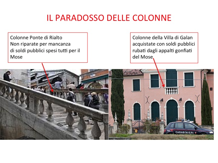 Non è retorica dire che ai tempi della Repubblica chi rubava soldi pubblici, se andava bene, finiva in prigione, o vogliamo ricordare che il Doge era ricco prima di diventarlo ma spesso finiva povero perché non poteva seguire più gli affari di famiglia, oggi invece va in politica per crearsi un impero di famiglia. Cosa avranno pensato i nostri antenati quando nel 1500 costruivano il ponte di Rialto, “chissà tra 500 anni come lo manterrano bene, e cosa sapranno fare dopo 500 anni di progressi di scienza e tecnica”, non avrebbero certo immaginato che i soldi pubblici sarebbero finiti nelle ville di un ex amministratore mentre il ponte cadeva a pezzi davanti agli occhi del mondo.